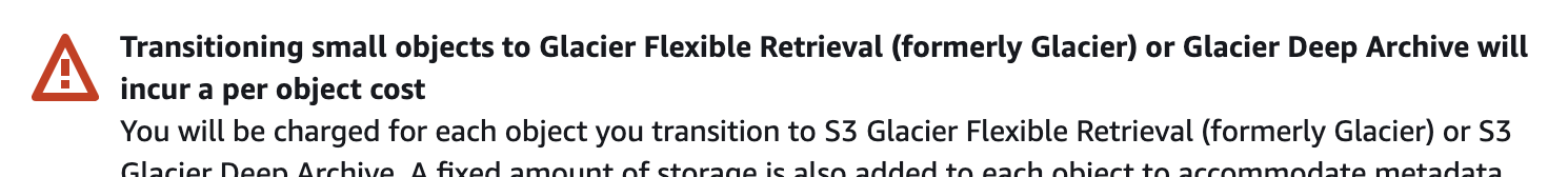 But isn't there like a million billion objects?? How about a different storage class? Requests & data retrievals > Lifecycle Transition requests into (per 1,000 requests). Even though the s3 console does not produce the ominous warning when selecting other storage classes, transitional request charges apply. Fuuuuuuuuu
