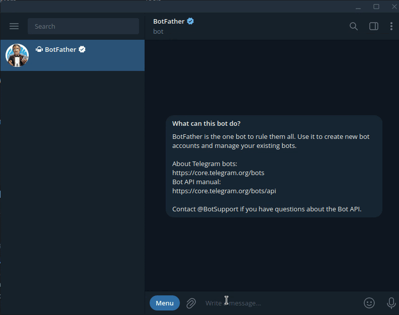 Using the Telegram client, start a conversation with the @BotFather.