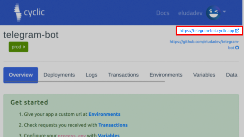 You want to tell Telegram to send the Webhook requests to your Cyclic server. So conclude this project by copying your Cyclic deployment’s URL and running these commands: