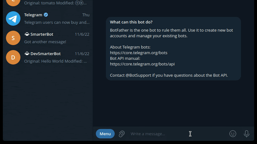 Furthermore, professional bots come with a profile picture and a well-formed description. You can do all of that by contacting @BotFather: